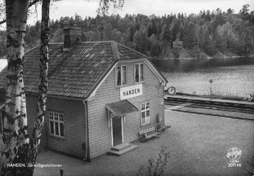 H0497 Stationshuset i Handen. Nynäsbanans stationsbyggnader, ritad av arkitekten Ferdinand Boberg. Bobergs stationshus längs med Nynäsbanan hade likartat utseende; trähus med gulmålade spånfasader och röda tegeltak.