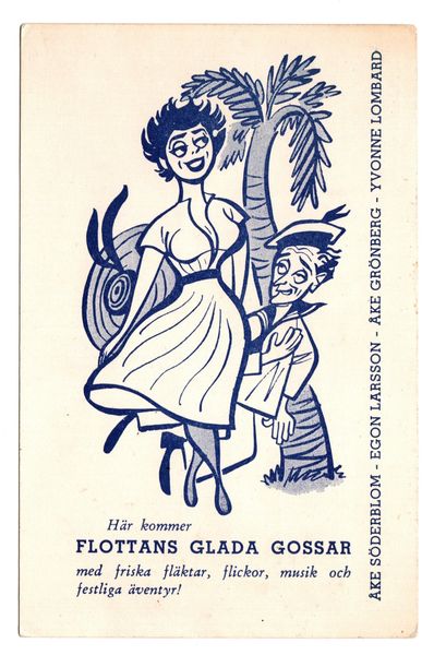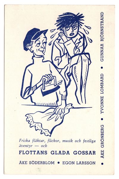Två reklamvykort för "Flottans glada gossar", en film i regi av Rolf Husberg med Åke Söderblom, Egon Larsson, Åke Grönberg, Gunnar Björnstrand och numera Stockholms stads äldste och längst tid anställde Yvonne Lombard. Filmen släpptes i dagarna, 16 februari 1954, med blandad kritik. Handling: