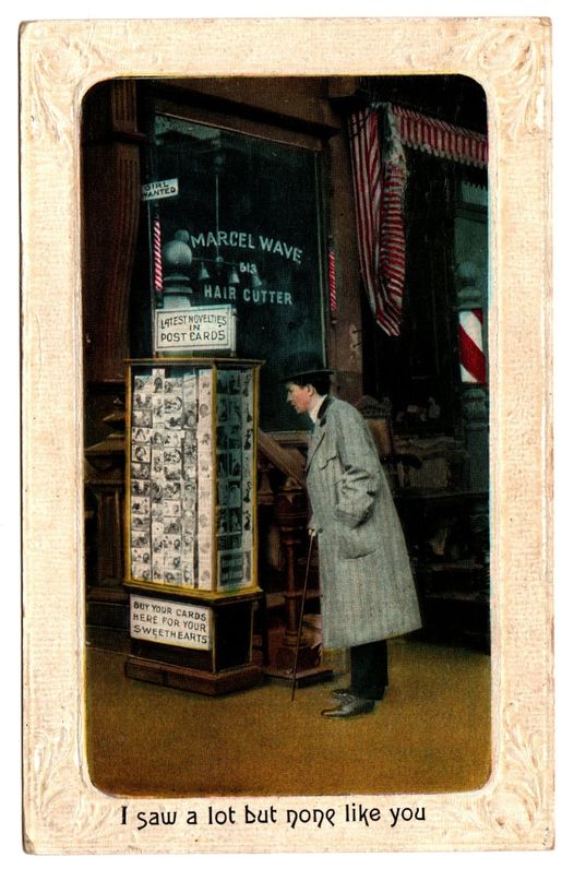 "LATEST NOVELTIES IN POSTCARDS" tycks inte räcka till för den här unge mannen!