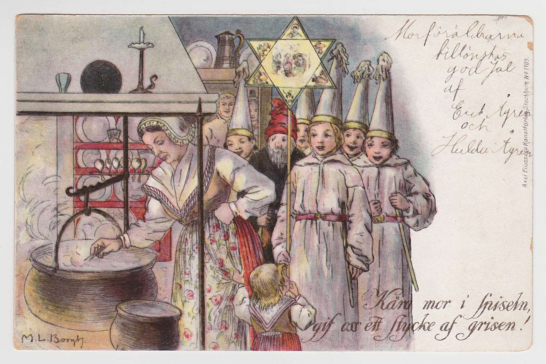 Hursomhelst är hennes Nationalbrevkort med 10 motiv från Staffansvisan ett av Axel Eliassons huvudnummer till julen 1902. Korten är mycket genomarbetade och tyder på en professionell utbildning.