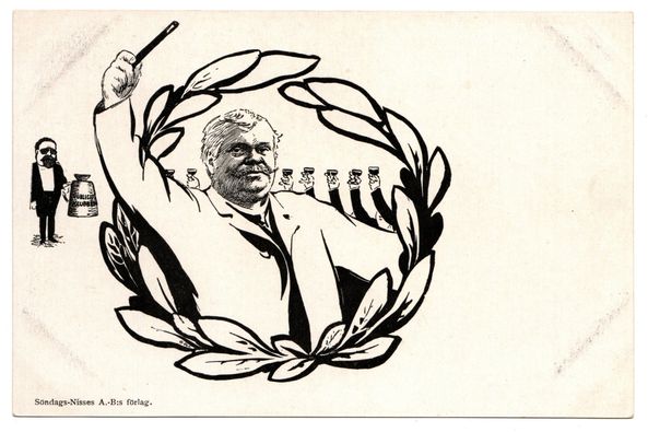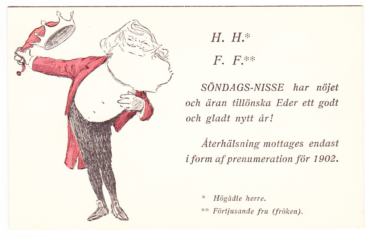 På vykort är han sällsynt, har hittat två kort från tiden, ett "riktigt" vykort som troligen föreställer Karl Staaff ett par år innan han blev statsminister första gången 1906, samt ett kort som manar till en förnyad prenumeration på Söndags-Nisse inför 1902.