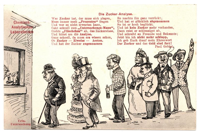 Vykortet, skickat 1909, visar kön till urinprovsanalys för att kunna diagnosticera diabetes.