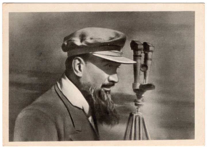 På vykortet från 1954 ser vi "atombombens fader" i Sovjet, fysikern Igor Kurchatov, som observerar ett kärnvapenprov. Kurchatov fanns kvar i projektet och bidrog också till vätebombsutvecklingen men vetenskapsmannen i täten och idégivaren var Andrej Sacharov, sedermera Nobelfredspristagare 1975.