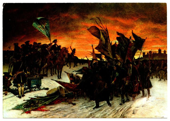 Målningen visar hur de förlorande ryssarna lägger ner sina vapen framför den segrande svenska armen.